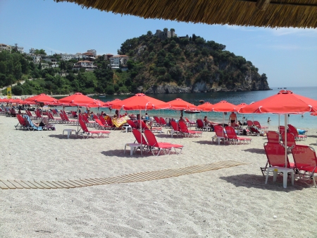On the beautiful beach of Valtos we have our own sunbeds (with the red umbrella's).